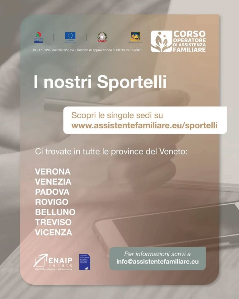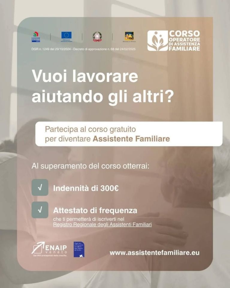 ✨ È disponibile il corso gratuito per diventare Operatore di Assistenza Familiare, promosso da ENAIP Veneto e finanziato dalla Regione Veneto.